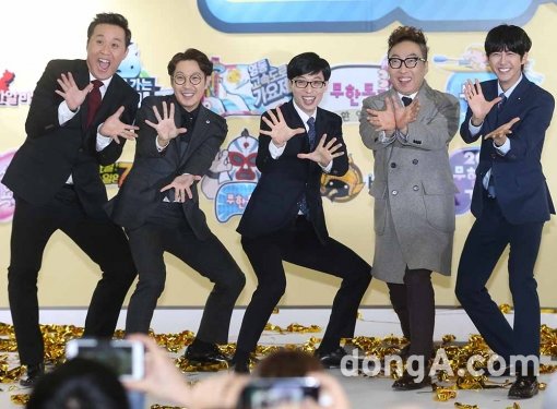 방송인 정준화, 하하, 유재석, 박명수, 광희(왼쪽부터)가 17일 오전 경기 일산 킨텍스에서 열린MBC '무한도전' 엑스포 개막식에 참석해 무한도전 공식 포즈를 취하고 있다.