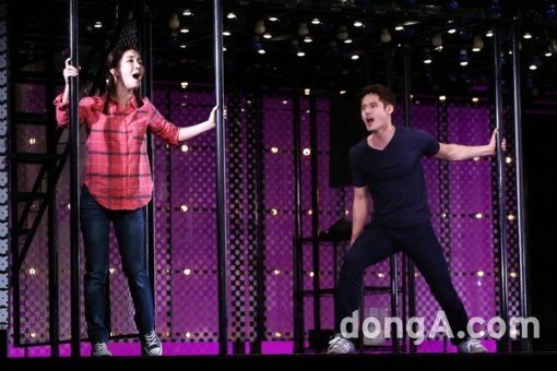 배우 오소연(왼쪽), 서경수가 17일 오후 서울 종로구 두산아트센터에서 열린 뮤지컬 ‘넥스트 투 노멀’ 프레스콜 무대에서 공연을 하고 있다.