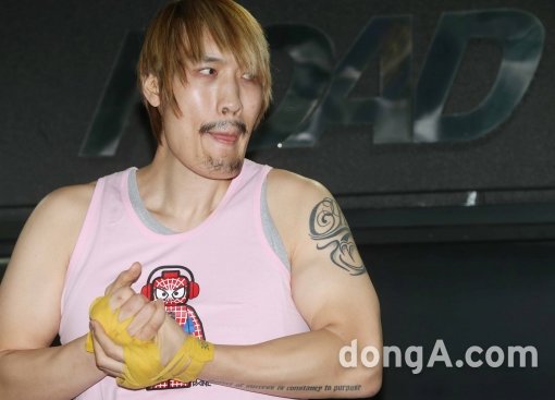 파이터 최홍만이 17일 오후 서울 강남구 압구정짐에서 열린 ‘XIAOMI ROAD FC 027 IN CHINA’ 기자회견에서 시연을 하기 위해 준비를 하고 있다.