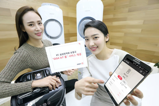 KT는 삼성전자와 함께 가전제품과 연동되는 ‘기가 IoT 홈’을 연내 제공한다고 17일 밝혔다. 삼성전자는 스마트 가전의 제어·연동 기술을 지원하고, KT는 이 기술을 활용한 기가 IoT 홈 서비스를 제공한다. 이를 위해 양사가 보유한 플랫폼인 ‘기가 IoT 홈 플랫폼’과 ‘가전 서버’를 연동해 이용자의 가정 내 와이파이 연결로 공유기를 통한 호환이 가능하도록 개발을 완료했다.