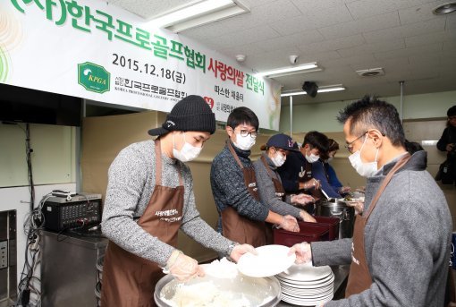 KPGA 코리안투어 발렌타인 대상 수상자 이태희(31·OK저축은행)와 신인상, 베스트 플레이어 트로피 2관왕을 차지한 이수민(22·CJ오쇼핑), 매일유업오픈 우승자 김대현(27·캘러웨이), KPGA 선수권 우승자 장동규(27), 선수회 대표 이인우(43) 등은 18일 서울 중구 서울역 인근 ‘따스한 채움터’에서 독거노인 및 노숙자을 위한 무료 급식 봉사활동에 참여했다. 이에 앞서 이인우 선수회 대표는 ‘2015한국프로골프대상 시상식’을 통해 기증받은 사랑의 쌀을 나눔운동본부에 전달했다.