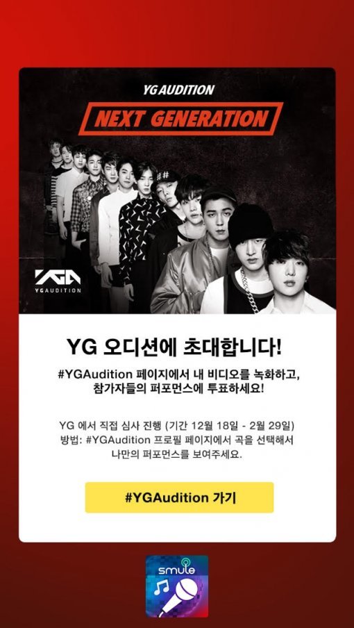 매년 수만명의 가수 지망생들이 꿈을 이루기 위해 도전하고 있는 YG글로벌 오디션이 18일부터 2016년 2월 29일까지 Smule의 글로벌 모바일앱 ‘Sing!가라오케’와 함께 진행된다.