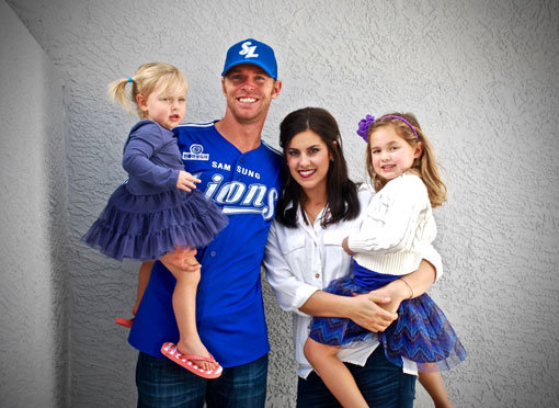 삼성과 총액 50만달러에 계약한 우완투수 콜린 벨레스터가 삼성 유니폼을 입고 가족과 함께 밝은 표정으로 기념촬영을 하고 있다. 사진제공|삼성 라이온즈