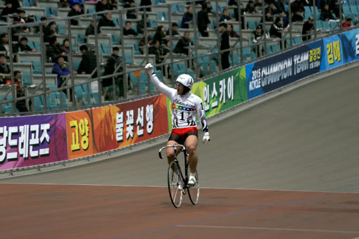 333.3m의 벨로드롬을 5바퀴(1691m) 도는 이날 결승엔 박용범(김해), 황승호(팔당), 이현구(김해), 김민철(광산), 정종진(계양), 이명현(김해), 유태복(고양) 등 7명이 진출했다. 결승은 박용범, 이현구, 이명현 등 3명이 진출한 김해팀과 황승호 정종진 유태복 등 3명의 수도권팀과의 대결구도였다. 그러나 속을 들여다보면 사실상 한솥밥을 먹고 있는 ‘김해팀’의 집안싸움으로 예상됐다. 예상은 적중됐다. 박용범이 우승 테이프를 끊으면서 김해팀의 완승으로 끝났다.