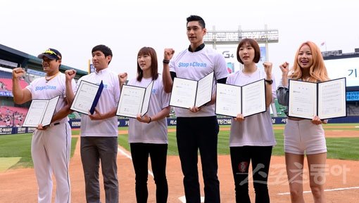 ‘불법 스포츠 도박 추방을 위한 연중 캠페인-SAC!(Stop & Clean)’ 홍보대사들이 6월 4일 잠실야구장에서 열린 선포식에서 승부조작과 불법 스포츠 도박 등에 대한 근절 서약을 한 뒤 기념촬영을 하고 있다. 왼쪽부터 프로야구 홍성흔, 남녀프로농구 양동근 박혜진, 남녀프로배구 김요한 황연주, 걸그룹 EXID 솔지. 스포츠동아DB