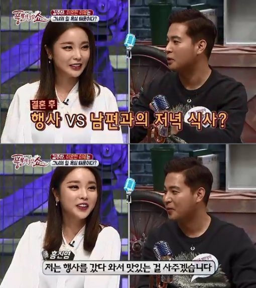 김주하의 일화에 홍진영이 “노력이 있어야만 지킬 수 있는 자리”라며 안타까움을 표하면서도 공감하자 패널들은 홍진영에게 “행사와 남편과의 저녁식사 중에 무엇을 고를 것이냐”고 장난스럽게 물었다.