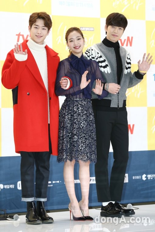 배우 서강준(왼쪽부터), 김고은, 박해진이 22일 오후 서울 영등포구 영등포 타임스퀘어에서 열린 케이블채널 tvN 드라마 ‘치즈인더트랩' 제작발표회에 참석해 포토타임을 하고 있다.