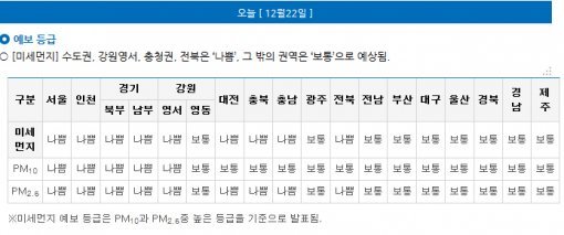 한국환경공단은 오늘(22일) ‘미세먼지’는 수도권, 강원영서, 충청권, 전북은 ‘나쁨’, 그 밖의 권역은 ‘보통’으로 예상했다.