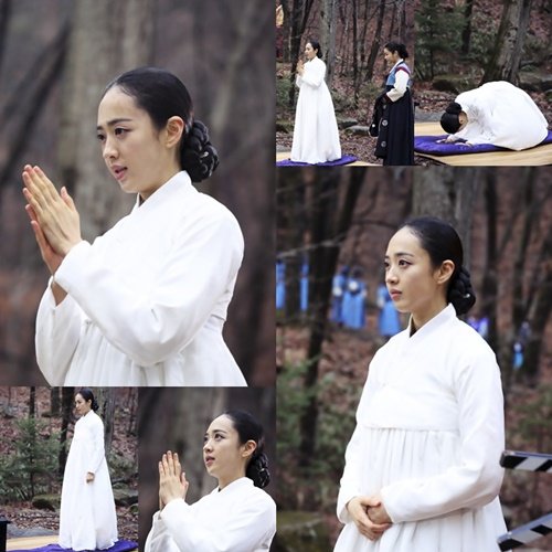 공개된 사진에서 김민정은 혹독한 추위 속에서 얇디얇은 홑겹의 속적삼 소복만을 입은 채 산속에서 기도를 올리고 있다.