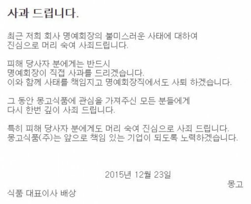 몽고식품은 1905년 설립된 장수기업으로 대표제품으로는 몽고간장이 있다. 네티즌 등 소식을 접한 다수의 사람들은 “최근 대한민국을 빛낸 위대한 인물대상을 받은 사람이 이럴 수가”, “몽고식품 불매운동을 벌여야 한다”는 등 강한 불만을 쏟아내고 있다.