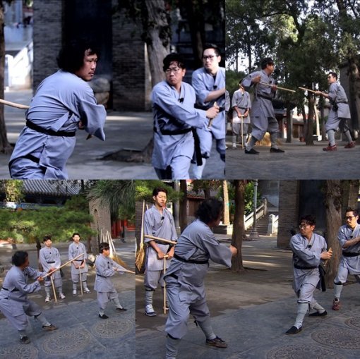 세 사람은 지팡이의 위치, 자세, 방향까지 모두 제각각이었다. 결국 웃음을 참지 못한 육중완이 분수처럼 뿜어 나온 침을 박철민 얼굴에 뿌리는가 하면, 지팡이를 돌리다가 서로를 가격할 뻔 하며 ‘환장의 궁합’을 선보였다. 지팡이 무술 앞에서 ‘바보 삼형제’가 된 세 사람의 모습에 ‘호랑이’ 옌첸 사부조차 어이없는 실소를 터트렸다.