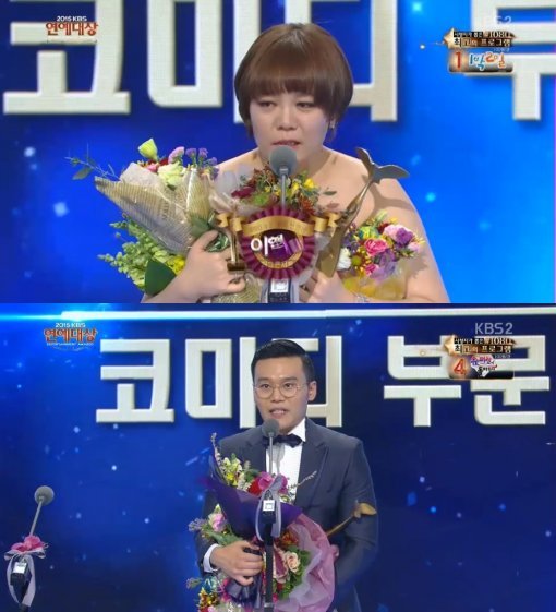 이현정은 이날 신인상 코미디 부문에서 여자 신인상을 받았다. 그는 '개그콘서트-불량 엄마'에서 아줌마 캐릭터를 독보적으로 소화하고 있다.