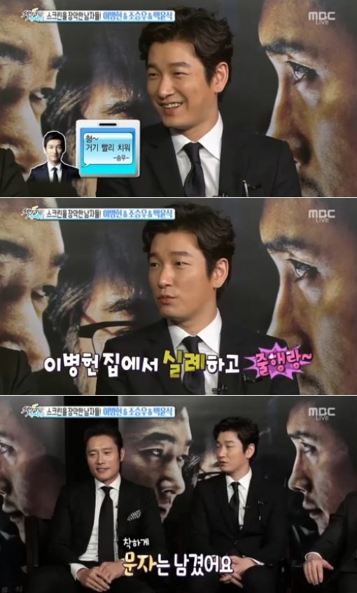 특히 술이 약하다는 조승우는 “내가 이병헌 집에 토를 해놓고 갔다. 그리고나서 문자로 빨리 치우라고 했다”고 고백해 웃음을 자아냈다.