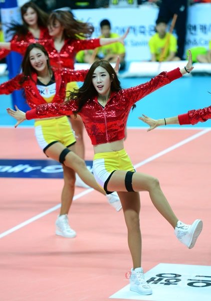 27일 안산 상록수체육관에서 '2015-2016 NH농협 V리그' 안산 OK저축은행과 구미 KB손해보험의 경기가 열렸다. OK저축은행 치어리더가 화려한 공연을 선보이고 있다.