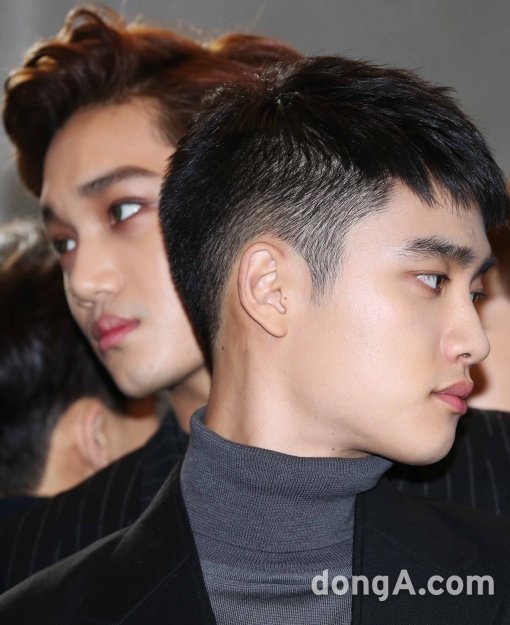 그룹 엑소의 디오(앞)와 카이가 27일 오후 서울 강남구 코엑스에서 열린 2015 SAF 가요대전에 참석해 포토타임을 하고 있다.