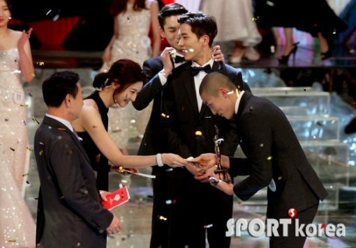 28일 오후 서울 강서구 등촌동 SBS 공개홀에서 열린 `2015 슈퍼모델선발대회`에 참가해 대상을 차지한 19번 손기성이 트로피를 받고 있다.