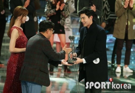 28일 오후 서울 강서구 등촌동 SBS 공개홀에서 열린 `2015 슈퍼모델선발대회`에 참가해 탑7에 뽑힌 8번 최웅이 특별상을 받고 있다.