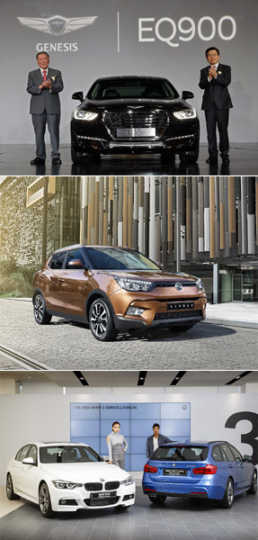 올해 국내 자동차시장은 경기침체에도 내수판매가 역대 최대치를 기록하고 수입차도 20% 가까이 늘어나는 등 크게 성장했다. (맨 위쪽부터)현대차가 미국 고급차 시장을 겨냥해 론칭한 전략 브랜드 제네시스의 첫 모델인 ‘EQ900’과 소형 SUV 시대를 이끈 쌍용차 ‘티볼리’, 수입차 판매를 견인한 ‘BMW 뉴 3시리즈’.