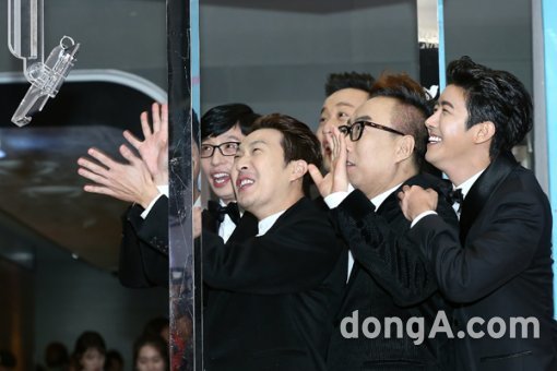 무한도전팀(유재석, 하하, 정준하, 황광희, 박명수)이 29일 오후 서울 마포구 상암MBC에서 열린 2015 MBC 방송연예대상 시상식에 참석해 포토타임을 하고 있다.