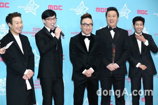 무한도전팀(하하, 유재석, 박명수, 정준하, 황광희)이 29일 오후 서울 마포구 상암MBC에서 열린 2015 MBC 방송연예대상 시상식에 참석해 포토타임을 하고 있다.