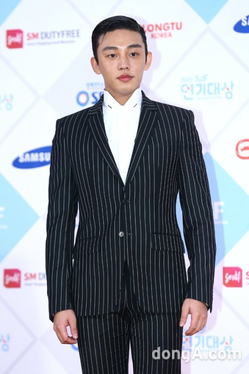 배우 유아인이 31일 오후 서울 강남구 코엑스에서 열린 ‘2015 SBS 연기대상’ 시상식에 참석해 포토타임을 하고 있다.