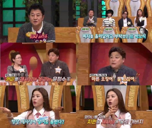이날 방송에 ‘서울·경기 대표’로 출연한 배우 박준규는 “아버지 제사상에 피자를 올린다”고 말해 스튜디오를 깜짝 놀라게 만들었다. 이어 “아버지가 생전에 피자를 좋아하셨다. 그래서 돌아가시기 전에 부탁하셨다”면서 “제사상에 꼭 피자를 올리라고 말씀하셨다. 그래서 그것만은 꼭 지키려 한다”고 전했다.