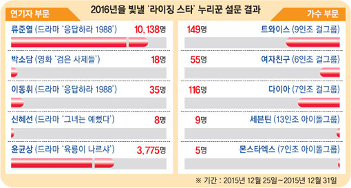 지난해 12월25일부터 31일까지 7일 동안 스포츠동아 홈페이지에서 누리꾼을 대상으로 한 올해 설문조사는 연기자와 가수 부문으로 나눠 진행했다. 팬덤이 비교적 쉽게 형성돼 특정 신인에게 쏟아지는 관심을 분산시키려 했다.