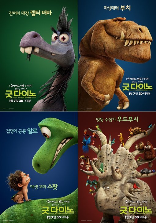 이번에 공개된 캐릭터 포스터에서는 재미와 감동을 책임 지는 두 주인공 ‘알로’와 ‘스팟’ 외에도 엉뚱수집가 ‘우드부시’, 잔머리 대장 ‘랩터 버바’, 마성매력 ‘부치’까지 만날 수 있다. 조연 캐릭터들은 ‘알로’와 ‘스팟’이 위험천만한 모험 속에서 만난 친구들이다. 인간과 공룡이 공존하는 상상 속이 지구에는 우리가 감히 상상할 수 없는 그 이상의 생명체들이 산다. 이 중에서도 우드부시, 랩터 버바, 부치는 헤어나올 수 없는 매력으로 영화를 미리 본 관객들에게 큰 사랑을 받고 있다.