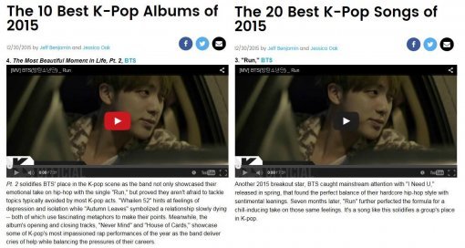 지난 달 30일(현지 시간) 빌보드는 ‘2015 베스트 K-POP 앨범 10’과 2015 베스트 K-POP 노래 20’을 발표하며 방탄소년단의 <화양연화 pt.2>와 이 앨범 타이틀곡 ‘RUN’을 각각 4위와 3위로 선정했다.