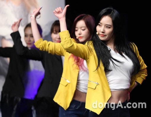 달샤벳의 우희가 5일 오후 서울 강남구 일지아트홀에서 열린 9번째 미니앨범 언론 쇼케이스에서 무대를 꾸미고 있다.