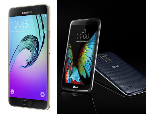 스마트폰 제조기업들이 새해 첫 신제품으로 보급형 모델을 출시하며 중저가 스마트폰 경쟁에 더욱 불을 지핀다. 삼성전자의 2016년형 ‘갤럭시A7’(왼쪽)과 LG전자의 ‘K10’. 사진제공|삼성전자·LG전자