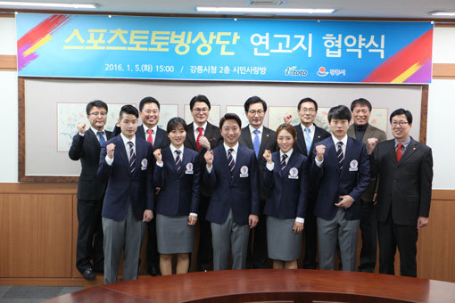 체육진흥투표권 스포츠토토의 수탁사업자인 ㈜케이토토(www.ktoto.co.kr)와 강릉시가 5일 강릉시청 2층 시민사랑방에서 ‘스포츠토토 빙상단’ 연고지 협약식을 열고, 대한민국 빙상과 지역사회 발전을 위해 함께 노력할 것을 다짐했다.