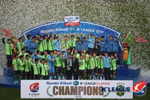 ‘현대오일뱅크 K리그 클래식 2015’ 우승을 차지한 전북현대 선수단이 트로피를 들고 환호하고 있다. 전북은 모기업의 든든한 후원을 바탕으로 K리그 클래식(1부리그) 2연패를 달성했다. 프로뿐 아니라 유소년, 여자 등 한국축구 전반에 걸친 고른 발전을 위해선 적극적 투자가 이뤄져야 한다. 사진제공|프로축구연맹