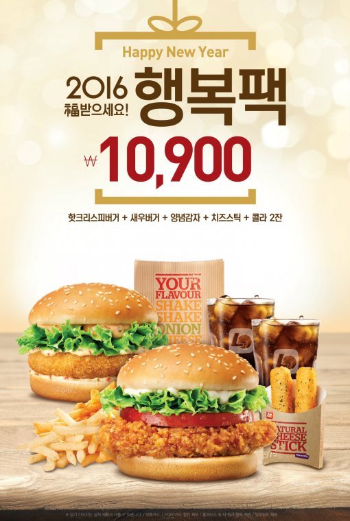 롯데리아(대표: 노일식)가 2016년 새해를 맞이해 롯데리아 스테디셀러 제품을 활용해 새롭게 구성한 행복팩을 판매하고, 다양한 할인 이벤트를 운영한다.