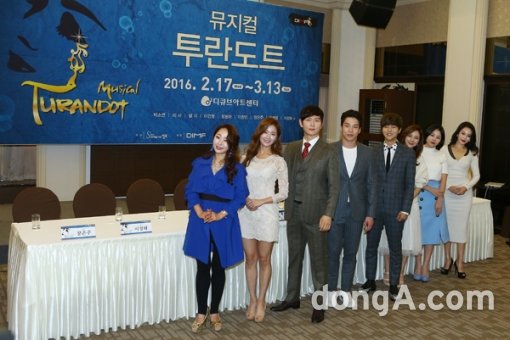 배우 장은주(왼쪽부터), 이정화, 이건명, 이창민, 정동하, 박소연, 알리, 리사가 7일 오전 서울 중구 한국프레스센터에서 열린 뮤지컬 ‘투란도트’ 제작발표회에 참석해 하고 있다.