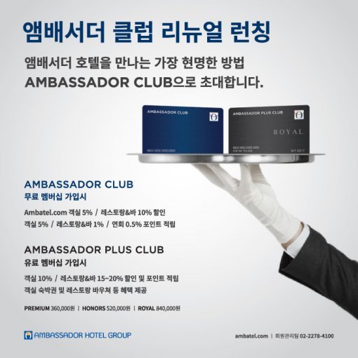 연회가 없는 무료 멤버십 ‘앰배서더 클럽’은 가입 즉시 객실 5%, 레스토랑&바 10% 할인 및 포인트 적립이 가능하다. 이용실적에 따라 클래식, 실버, 골드, 플래티늄으로 나뉘며 등급에 따라 웰컴 드링크, 체크아웃 시간 연장, 객실 업그레이드, 이그제큐티브 라운지 이용 혜택 등을 제공한다.