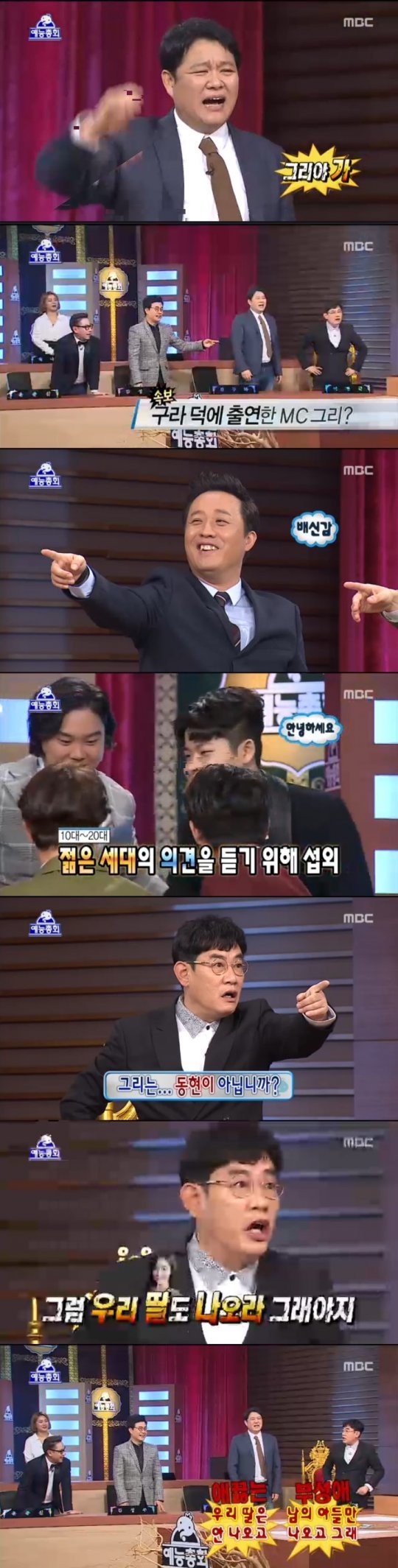 이날 패널로 MC 그리가 등장하자 김구라는 “그리야, 음모야”라고 하며 가라는 제스처를 취해 웃음을 자아냈다.