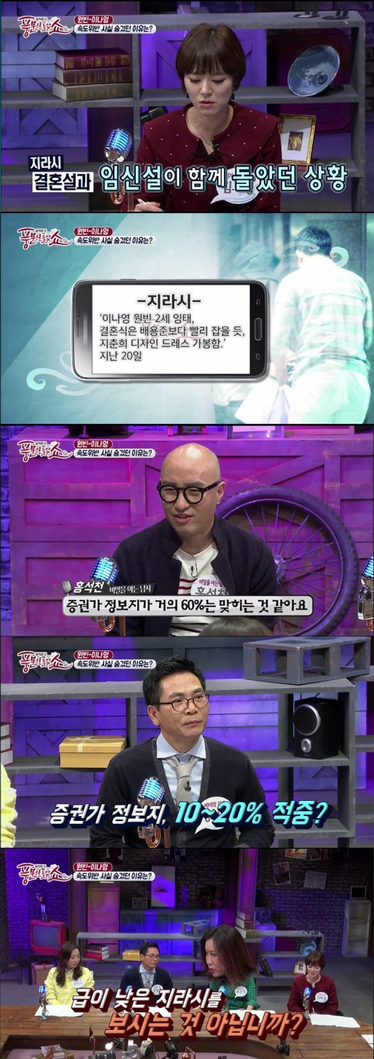 한 패널은 “증권가 지라시는 두 사람의 결혼설과 임신설을 함께 다뤘다”며 “원빈과 이나영이 연내에 결혼을 하는데 아이를 가졌기 때문에 배용준 박수진 부부보다 식을 빨리 진행할 것이라는 내용이 돌았다”고 밝혔다.