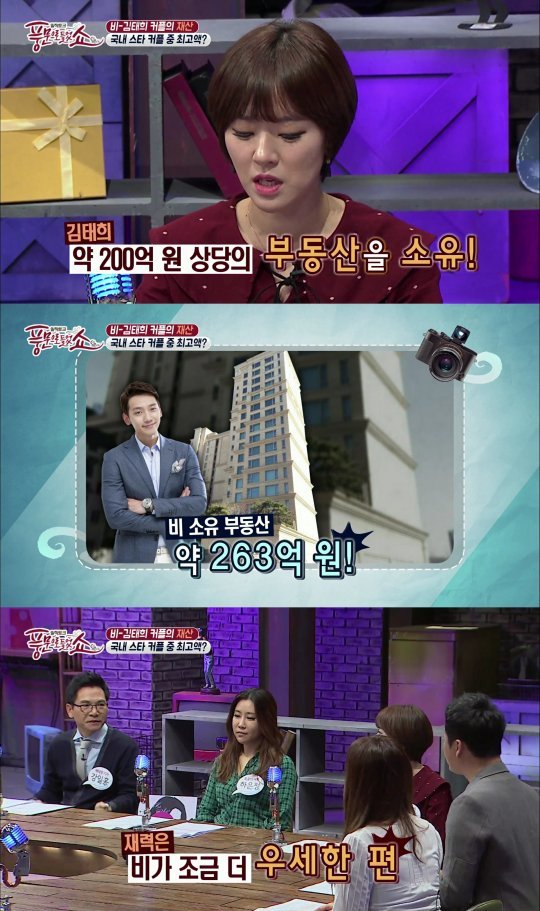 이어 기자는 “비는 삼성동 주택과 도산대로 빌딩까지 합하면 263억원의 부동산을 보유하고 있으니 부동산 액수만 비교하면 비가 조금 더 우세하다”고 덧붙여 패널들을 놀라게 했다.