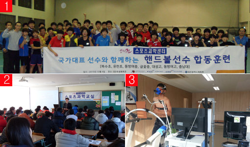 대전스포츠과학센터는 지난해 9월 개소 이후 지역 선수들에 대한 지원을 위해 4개월을 쉼 없이 달렸다. 국가대표선수와 함께 하는 핸드볼 합동훈련(사진 1), 스포츠 관련 지식을 전하는 스포츠과학교실(사진 2), 센터를 방문한 선수의 체력측정(사진 3) 등 다양한 방법으로 지역 우수선수 육성을 위한 지원군 역할을 톡톡히 하고 있다. 사진제공|국민체육진흥공단