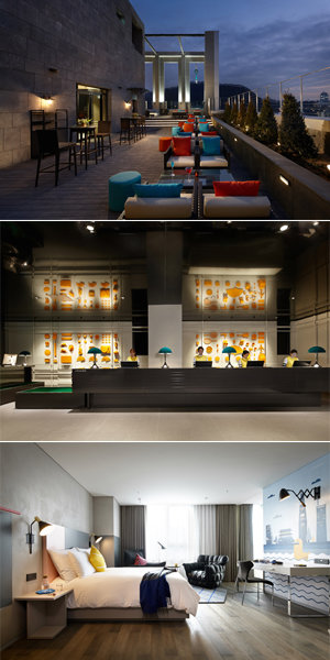 롯데호텔이 처음 도입한 라이프스타일 브랜드 L7 명동이 자랑하는 루프탑바 플로팅. 노란색을 테마로 캐주얼하게 디자인한 유니폼을 입은 L7 명동 호텔리어와 토드 홀로우백의 작품이 걸린 로비 라운지, 캐릭터 디자이너 그룹 모모트의 그래픽 아트로 장식한 스위트룸 ‘로코믹스 스위트’.(맨 위쪽사진부터) 사진제공|롯데호텔