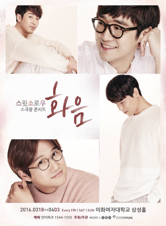 소중한 순간을 아름다운 하모니로 가득 채워줄 스윗소로우의 ‘화음’은 3월 18일부터 4월 3일까지 매주 금,토,일 총 9회로 진행되며, 스윗소로우는 현재 매회 다른 공연을 선사하기 위해 열심히 공연 준비 중에 있다. 티켓은 1월 19일(화) 오후 2시부터 인터파크 티켓 예매사이트에서 예매가 가능하다.