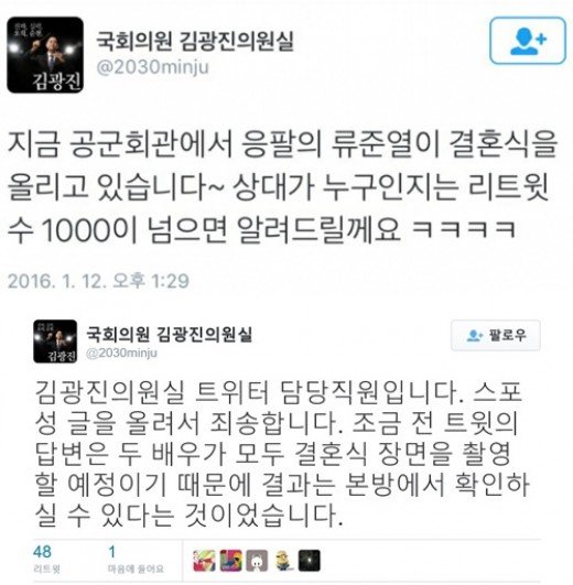 12일 더불어민주당 소속 김광진 의원의 공식 SNS에 “김광진의원실 트위터 담당직원입니다. 스포성 글을 올려서 죄송합니다. 조금 전 트윗의 답변은 두 배우가 모두 결혼식 장면을 촬영할 예정이기 때문에 결과는 본방에서 확인하실 수 있다는 것이었습니다”는 글이 게재됐다.