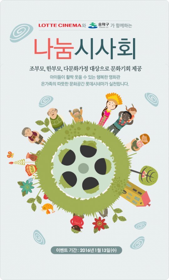 롯데시네마는 “ 모든 계층이 즐길 수 있는 문화공간을 제공하기 위해, 향후 송파구청과의 협업은 물론 지역사회 공헌활동을 통하여 더 많은 나눔을 드릴 수 있는 다양한 활동을 진행하도록 노력할 것”이라고 말했다.
