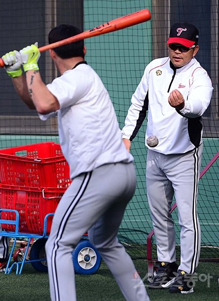 LG 양상문 감독이 2016시즌 주전 유격수는 오지환이라고 못 박았다. 오지환이 성실함과 책임감에서 후한 점수를 받았기 때문이다. 양 감독(오른쪽)이 지난 시즌 도중 직접 오지환의 타격훈련을 돕고 있다. 스포츠동아DB