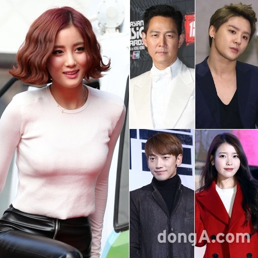 걸그룹 타히티의 지수-배우 이정재-가수 김준수-아이유-비(왼쪽부터 시계뱡항으로). 동아닷컴DB