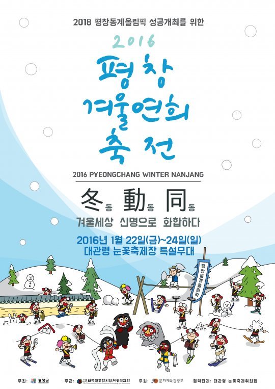 (사)한국전통연희단체총연합회 김덕수 이사장과 사물놀이패가 대관령 눈꽃 축제 현장에서 22일(월)부터 24일(수)까지 ‘2016 평창 겨울연희 축전’을 개최한다.