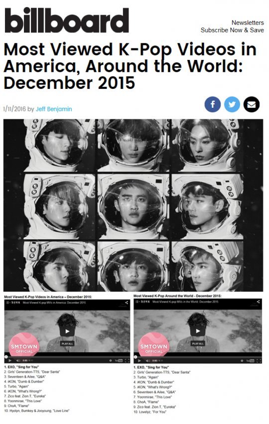 미국 빌보드는 지난 11일(현지시각) K-POP 칼럼 코너 K-TOWN에 ‘2015년 12월, 미국 및 전 세계에서 가장 많이 본 K-POP 뮤직비디오(Most Viewed K-Pop Videos in America, Around the World: December 2015)’라는 제목의 기사를 통해 12월 한 달간 미국과 전 세계에서 유튜브 최다 조회수를 기록한 K-POP 뮤직비디오 TOP 10을 발표, 1위는 엑소의 ‘Sing For You’가, 2위는 소녀시대-태티서의 ‘Dear Santa’가 나란히 랭크돼 SM 아티스트의 글로벌 파워를 다시 한번 입증시켜 주었다.