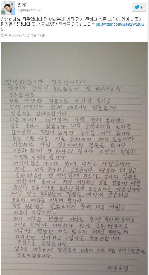 13일 오후 정우는 자신의 트위터를 통해 장문의 손편지 사진을 게재했다.