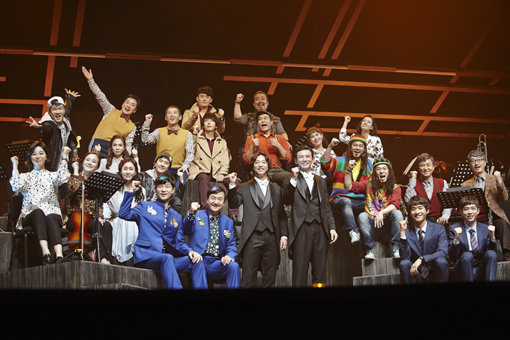 무대 위 배우들이 노래와 연기를 하는 동안 어둡고 침침한 피트 안에서 반주를 하는 오케스트라 단원들의 애환을 유쾌하게 그린 뮤지컬 오케피 출연배우들이 한 자리에 모여 파이팅을 외치고 있다. 사진제공|샘컴퍼니